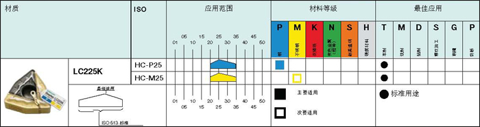 | Steeltec® LC225K 的优势在于:使用寿命延长 30%,提高了切削速度,坚硬和耐高温的黄色Al2O3 涂层;适于大部分钢材的加工。独特平滑的黄色陶瓷涂层可以防指印,并易于观察磨损情况。采用 Drytec 技术的散热表面结构保证了干车削性能。 |