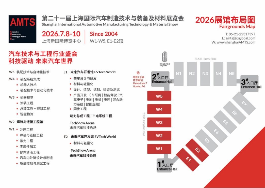 「AMTS汽车技术与工程展」将于2026年7月8-10日,再次登陆上海新国际博览中心W1-W5, E1-E2馆,预计将汇聚来自世界各地850家展商参展,吸引70,000专业观众到场参观,为海内外汽车技术与工程领域系统集成商、一二级供应商、整车及零部件研发与制造工程人员搭建一站式交流平台。
